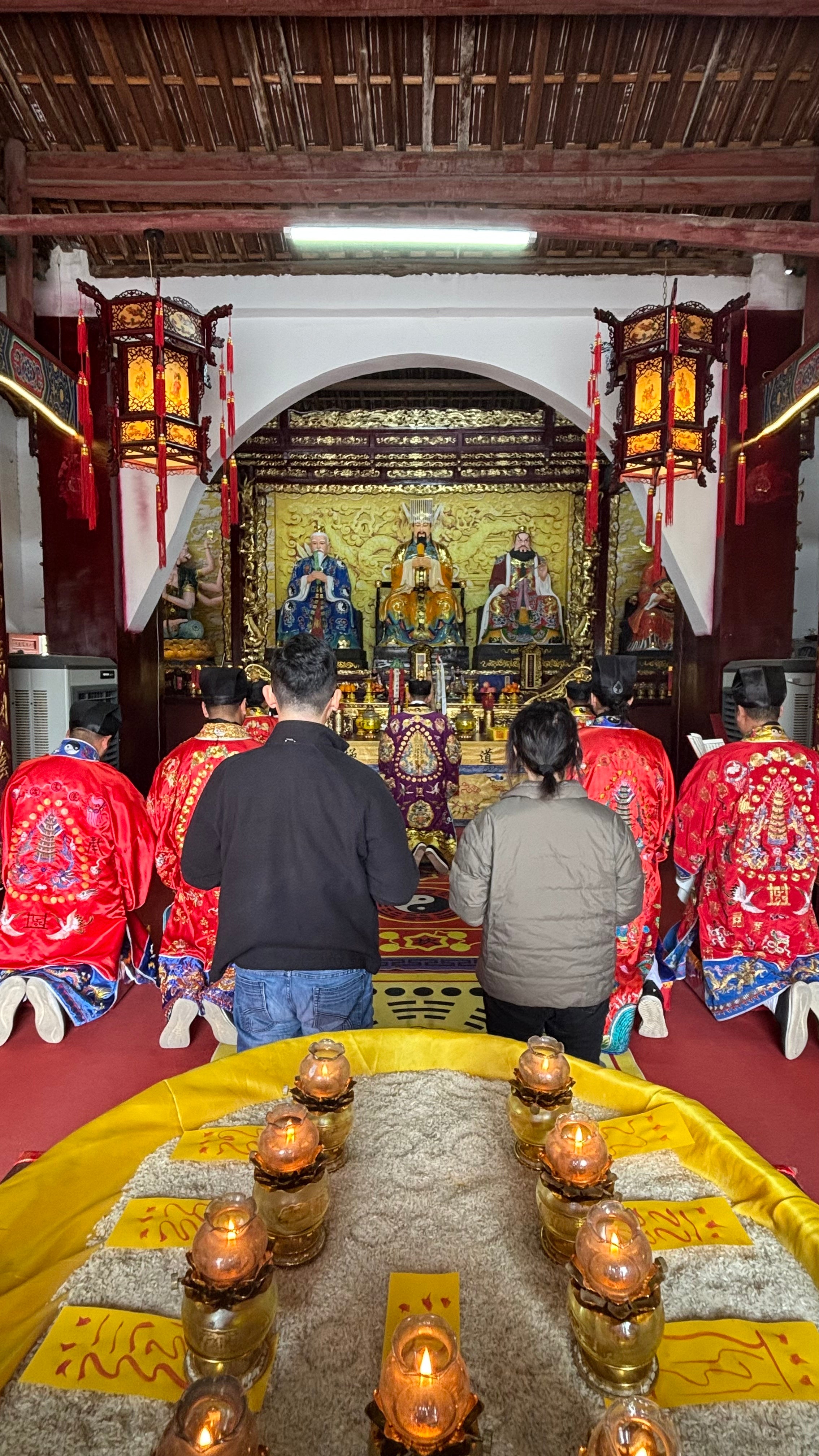 Solemn Submission of Petitions Amidst the solemn resonance of ritual music, the masters followed the liturgy to present the prayer petitions (Shuwen) for beneficiaries from far and wide, submitting them one by one to the Heavens. With utmost sincerity, they paid homage to the Presiding Deity of the Year, General Wen Zhe. The entire process was rigorous, and the spiritual atmosphere was profound, fully demonstrating the orthodoxy and professionalism of the Celestial Master lineage's millennial heritage.