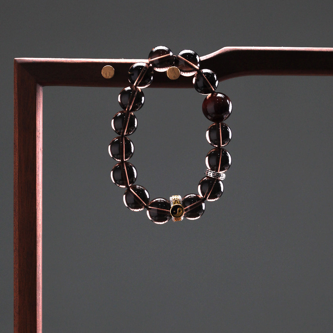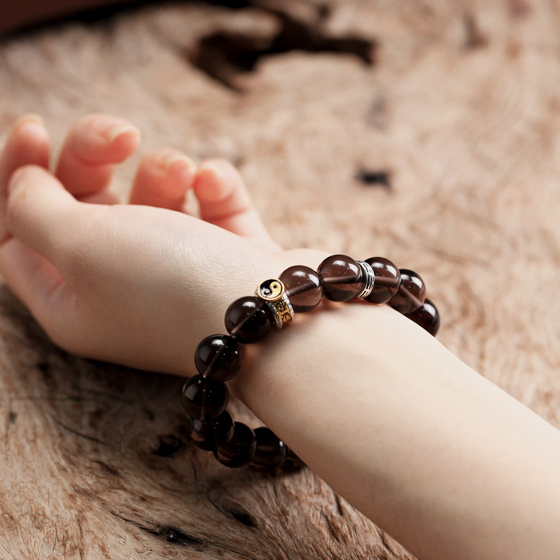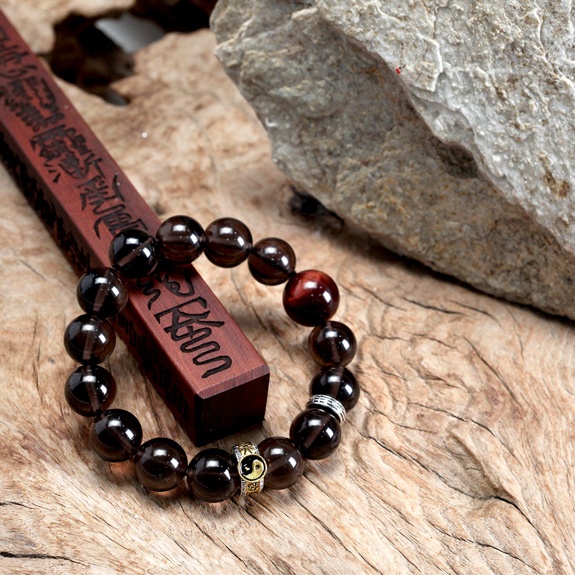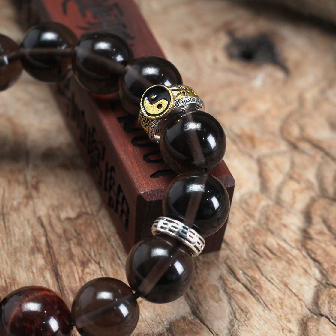 承龍虎山正一法脈千年道統,水五行的黑水晶主智慧與淨化,甄選天然黑水晶爲載體,每一顆皆是匠心而擇,珠色如幽潭藏墨,在光影下泛着深邃光澤。手串設計暗藏太極陰陽哲思——深墨色水晶聚陰柔沉靜之氣,搭配特色配飾,顯陽和靈動之象,讓腕間流轉天地陰陽周流之力。